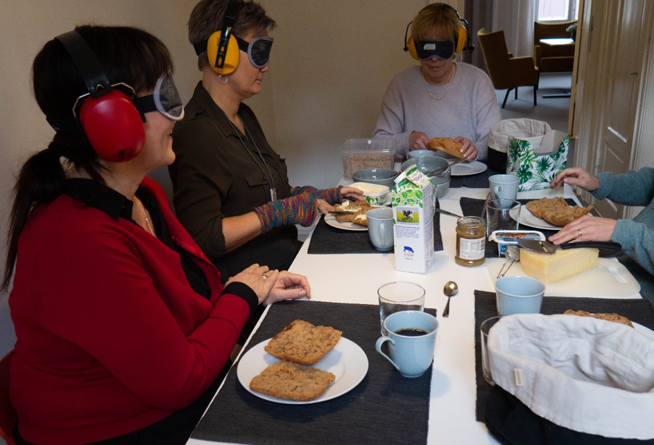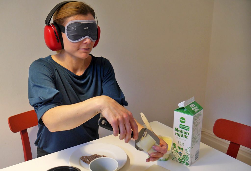 5. Personen/personerna med syn och hörselnedsättning får bre smörgåsar, välja pålägg och sedan äta.
