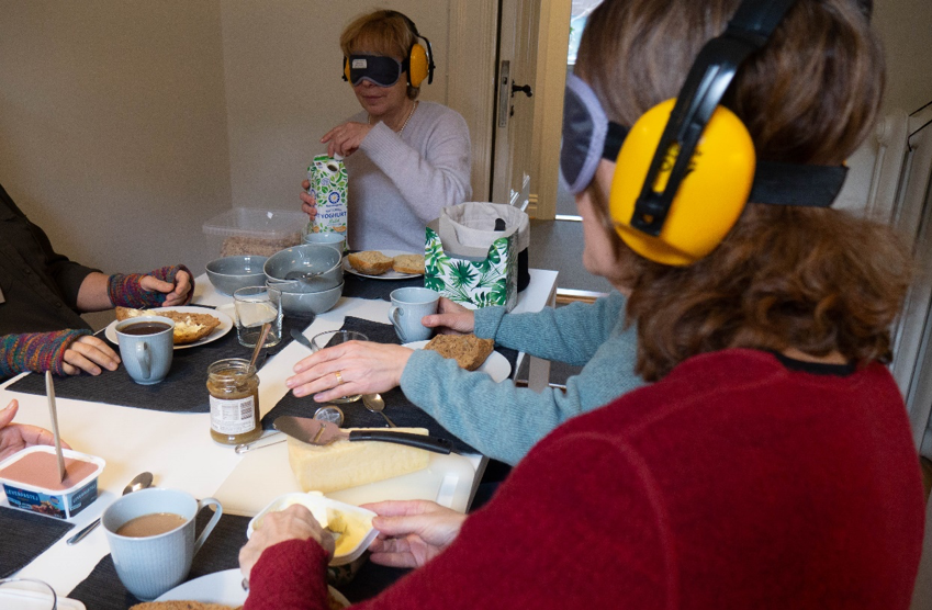 4. Någon ber en av personerna med kombinerad syn och hörselnedsättning att servera kaffet. Samtidigt reser sig några av de andra som sitter runt bordet och går tätt förbi den eller de som inte ser och hör.